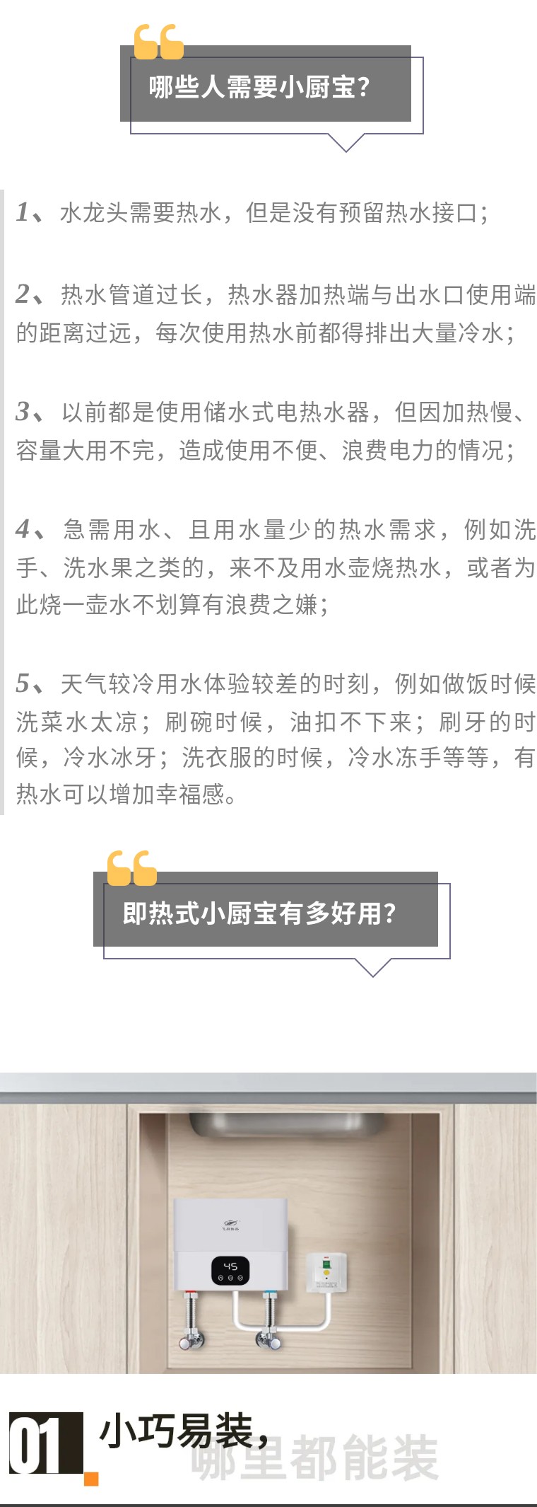 即熱式小廚寶沒有儲水箱,對櫥柜空間要求低,因為畢竟櫥柜底下空間有限,有一臺支持360度各種角度、豎直、倒立、平躺安裝的廚寶,可以更好的利用櫥柜里的每一分空間。